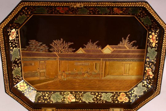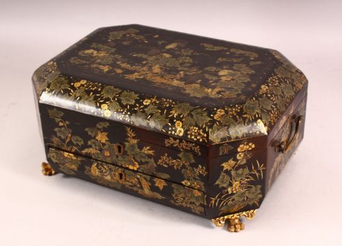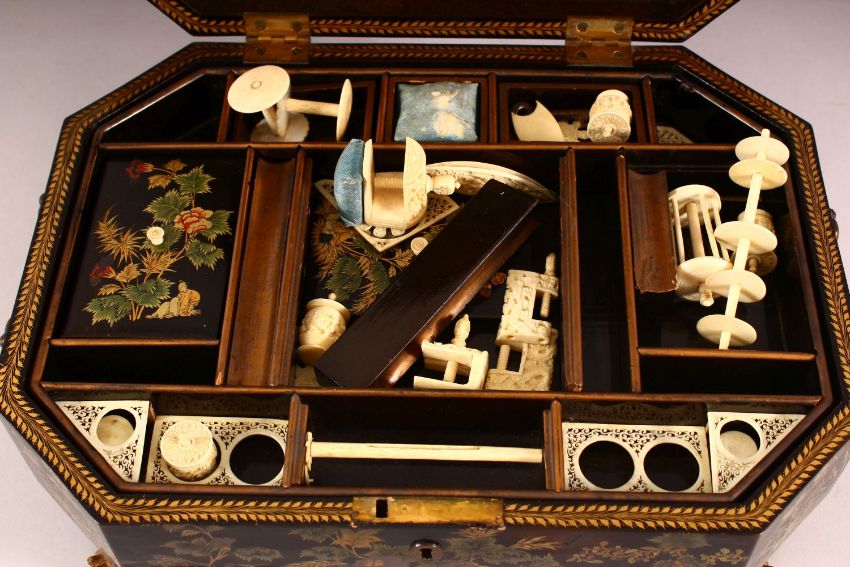 A GOOD CHINESE LAQUER DECORATED LIDDED SEWING BOX, decorated exterior with scenes of figures in landscapes with native floral display, the lid opening to reveal figures interior, with a removable shelf with multi compartments, with some carved ivory sewing implements, with a front draw and key stood on four claw feet, 35cm x 26cm
