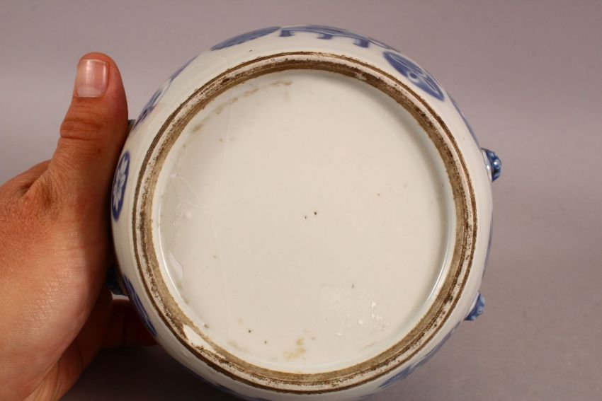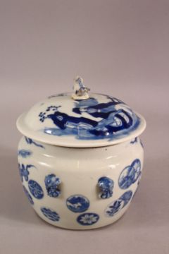 A 19TH CENTURY CHINESE BLUE& WHITE PORCELAIN JAR & COVER - Decorated with precious objects - the cover with figures and possibly marriage - with fish final - 16cm diameter.
