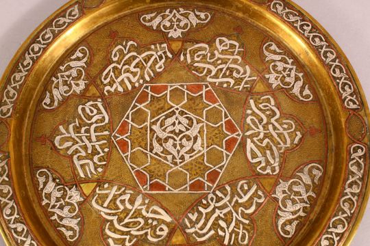 A GOOD INLAID BRASS CAIROWARE CALLIGRAPHIC DISH - with inlaid silver & copper with panels of calligraphy - 29cm