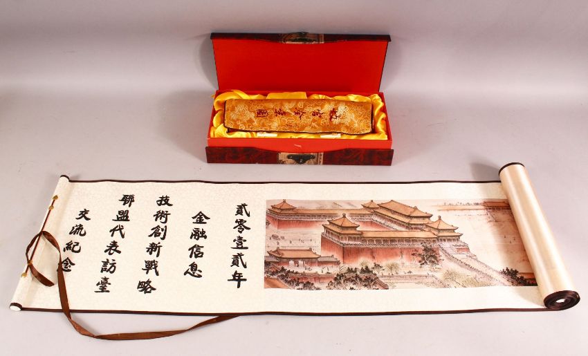 A MODERN DECORATIVE CHINESE SILK STYLE LANDSCAPE SCROLL PICTURE, in original fitted case and box, 300cm long, 25cm wide.