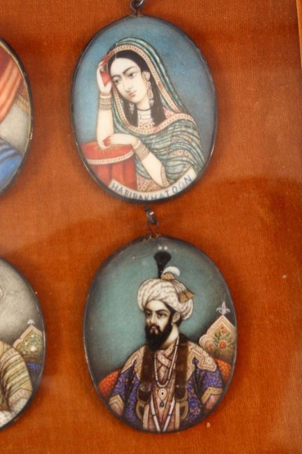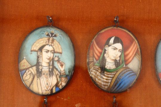 A SET OF 6 MINIATURE PERSIAN PAINTINGS, each depicting a prince or princess, each individually framed within one frame, possibly painted on ivory, 28.5cm x 25cm framed.