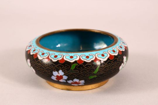 A 19TH / 20TH CENTURY CHINESE CLOISONNE BRUSH WASHER - decorated upon a black ground with native flora 10cm