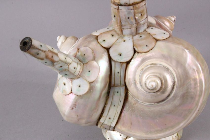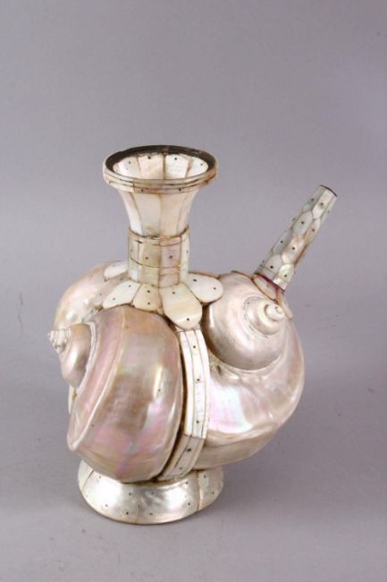 A UNUSUAL 18TH CENTURY INDIAN GOA INLAID MOTHER OF PEARL SHELL FORMED WATER EWER, 24cm X 22cm.