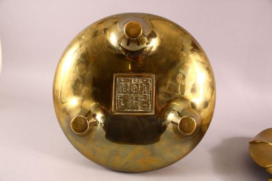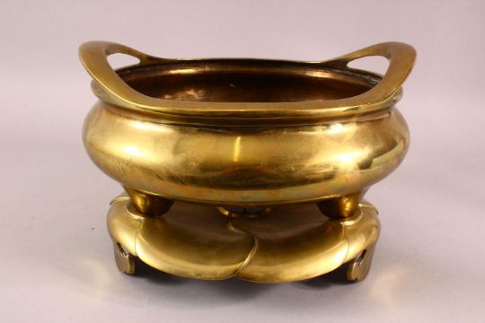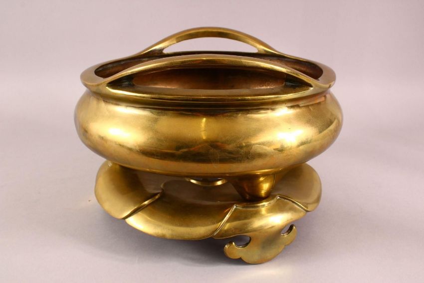 A LARGE BRONZE TWIN HANDLE BRONZE CENSER & STAND, the stand formed in lotus style, the censer with twin handles, the underside with a impressed seal mark 22cm x 32cm.