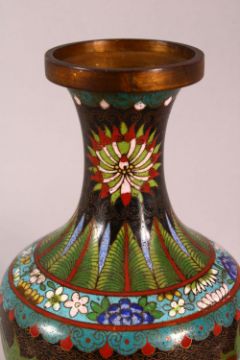 TWO CHINESE CLOISONNE VASES, one with dragons chasing pearls, the other with butterflies, 24cm & 15cm
