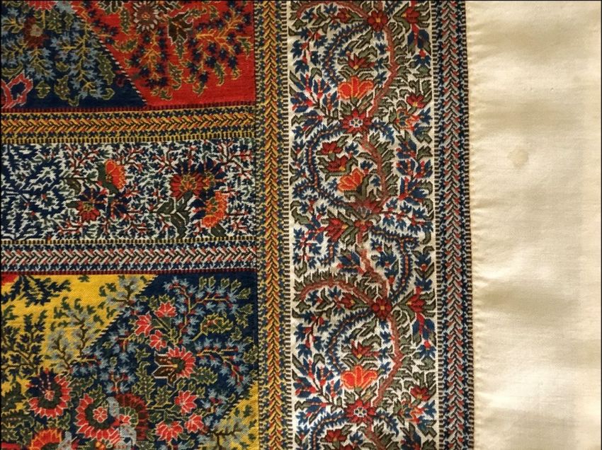 A EUROPEAN WOVEN SILK TURNOVER SHAWL, cream central panel within an embroidered border with fringe, 5ft 11in x 5ft 9in.