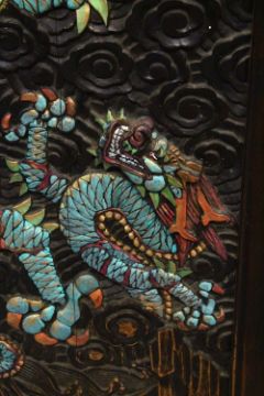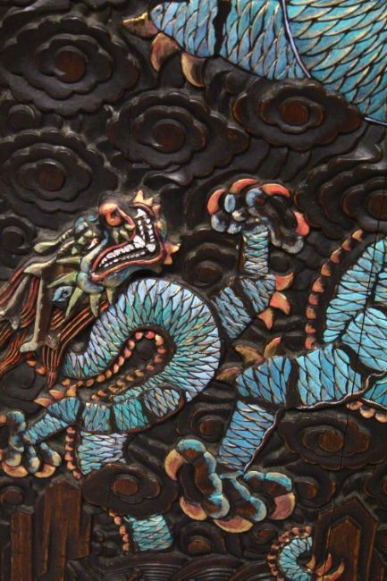 A PAIR OF CHINESE CARVED AND PAINTED HARDWOOD PANELS, depicting dragons each holding the pearl of wisdom amongst stylised clouds, a smaller dragon at the foot of each, 118cm x 76cm.