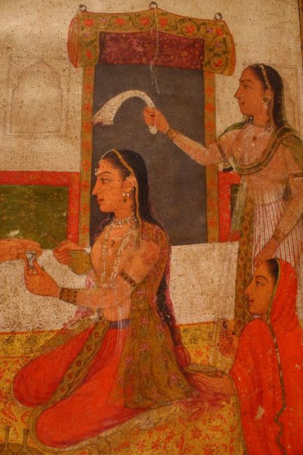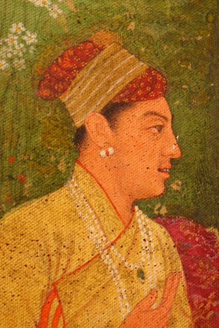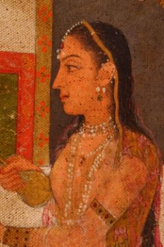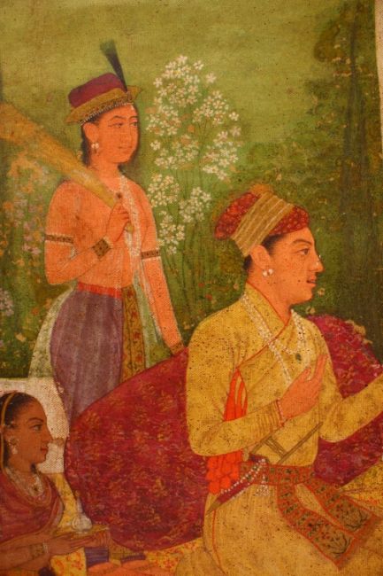 AN INDIAN PRINT ON CANVASS OF PRINCE AND ATTENDANTS, seated in the garden having a picnic, 83cm x 62cm