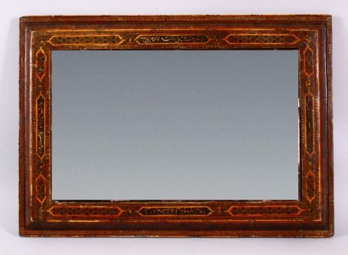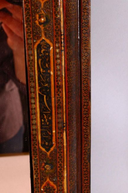 A LARGE 19TH CENTURY PERSIAN QAJAR KHATAMKARI MOSAIC INLAID WOODEN MIRROR, with calligraphy panels and miniature portraits, 56cm x 40cm.