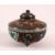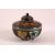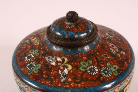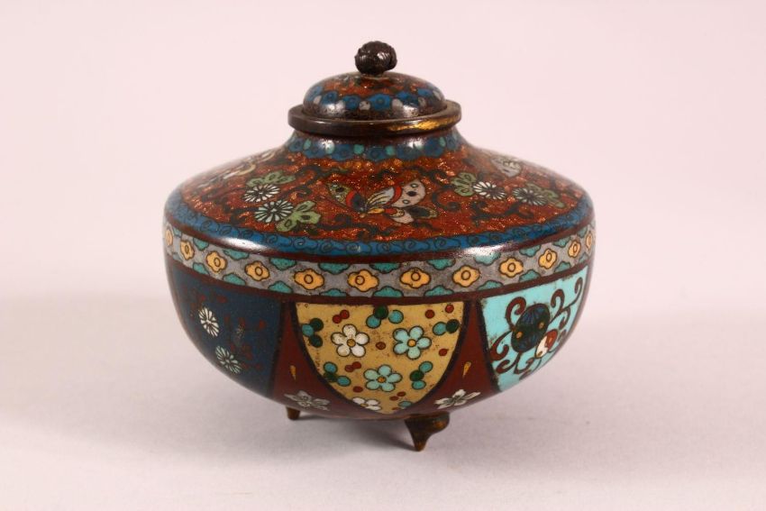 A CLOISONNE KORO AND COVER, decorated with butterflies, flowers and buddhistic emblems, on three feet, 11cm high.