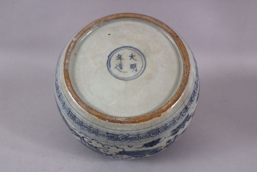 A CHINESE MING STYLE BLUE & WHITE PORCELAIN POT, decorated with scenes of figure in landscapes with floral borders, base with a four character mark, 20cm diameter,