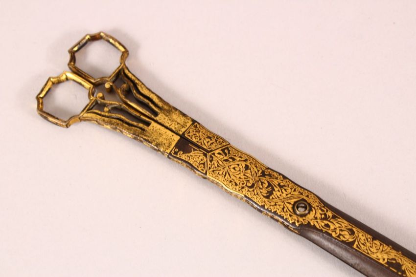A FINE LARGE 19TH CENTURY TURKISH OTTOMAN GOLD INLAID CALLIGRAPHIC SCISSORS, 27cm long.