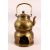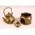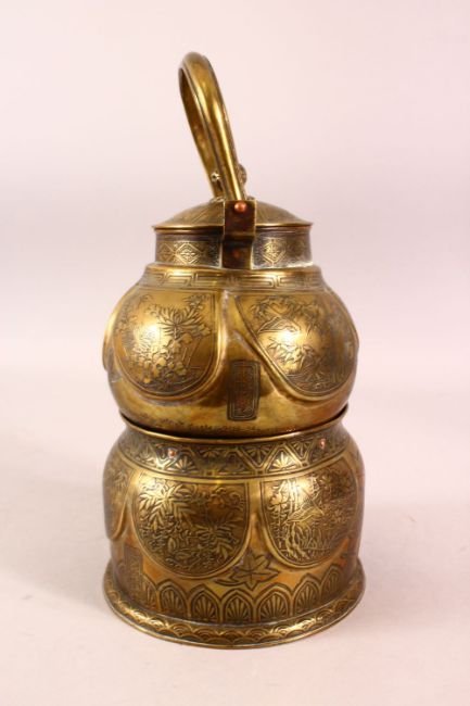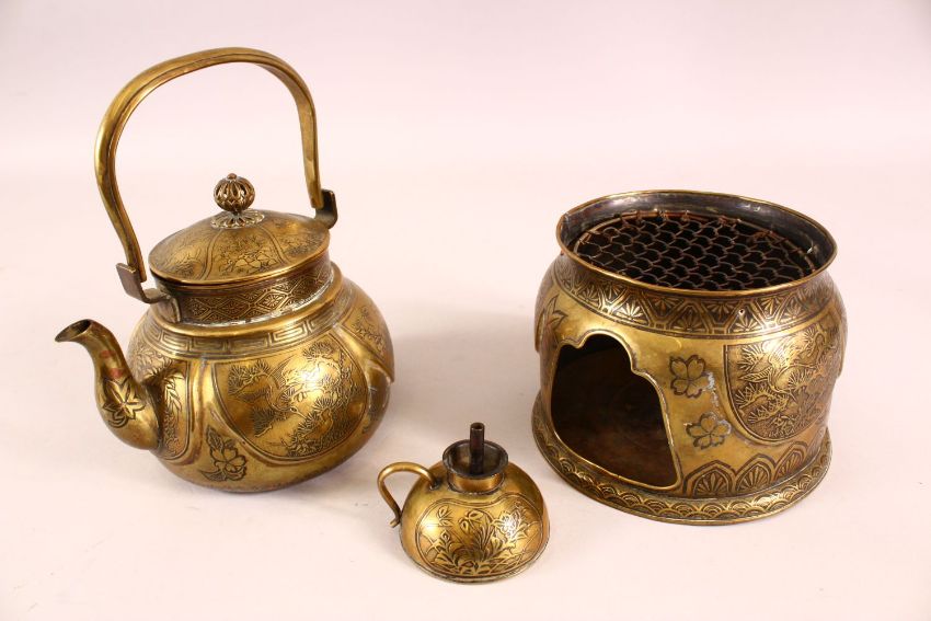 A JAPANESE MEIJI PERIOD BRASS TEA KETTLE & STAND - with carved panels of flora and birds, 25cm high in two pieces.