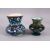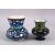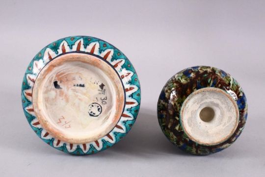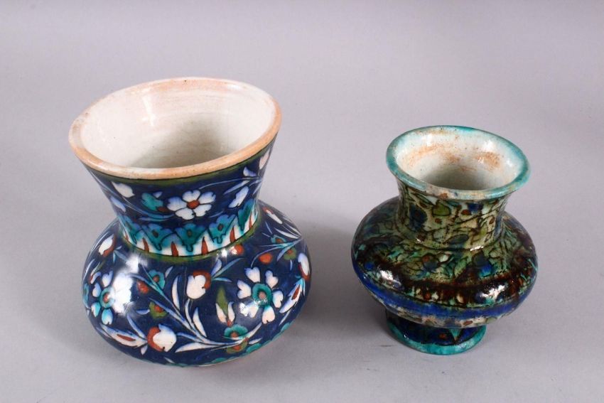 TWO JERUSALEM PALESTINIAN POTTERY FLORAL VASES, each with varying floral motif decoration, 13cm & 11.5cm.