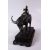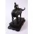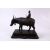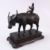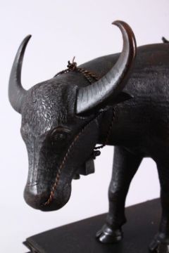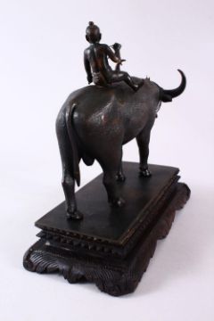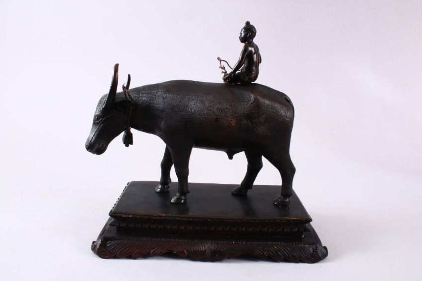 AN INDIAN JAIPUR SCHOOL BRONZE MODEL OF A COW, with a boy seated upon its back, mounted to a carved wooden base, 23cm high x 24cm wide.