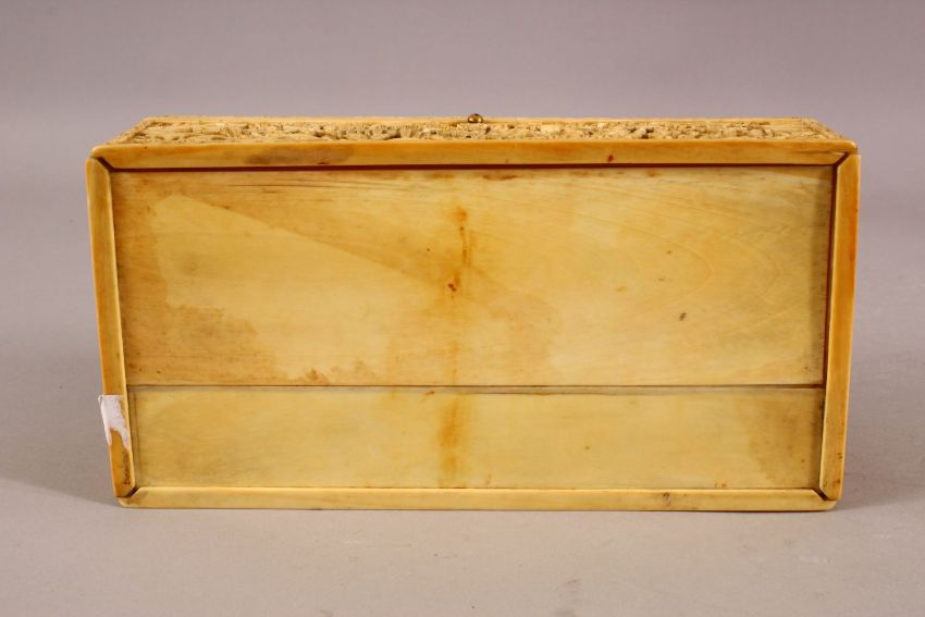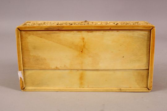 A FINELY CARVED CANTON IVORY CASKET, with well carved panels of scenes depicting figures in landscapes carrying out various pursuits, 22cm long, 11cm wide, 7.5cm high.