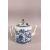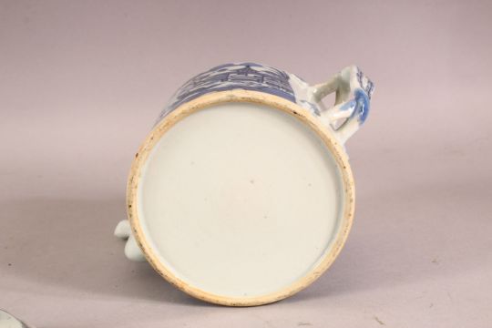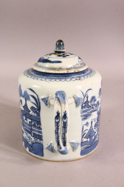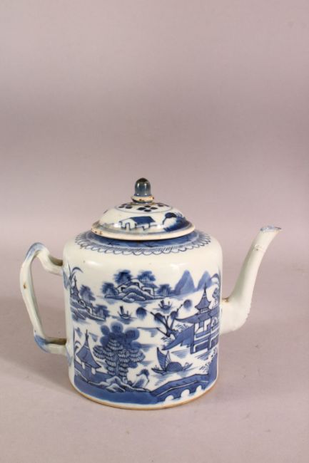AN 18TH CENTURY QIANLONG CHINESE BLUE & WHITE PORCELAIN TEA POT - the body decorated with scenes of native landscape views - with its cover - twisted formed handle, 16cm high x 20cm wide.