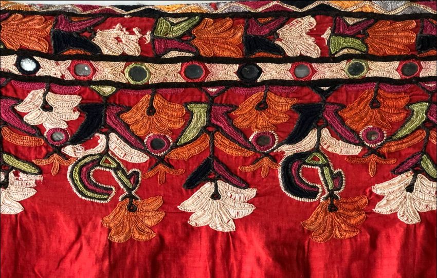 A LARGE KUTCH SINDH SKIRT, (possibly part only), 20th Century, fine cotton embroidered with mirrored detail, 3ft 9in x 2ft 9in approx.