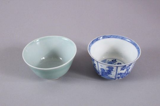TWO CHINESE PORCELAIN BOWLS, one kangxi style with panel decoration of flora, the base wwith a six character mark, the other with a celadon glaze, 8.5cm & 9cm
