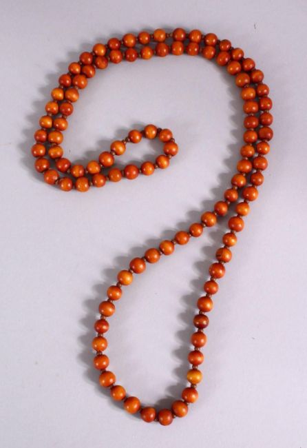 A RARE SET OF 19TH CENTURY CHINESE CARVED EXOTIC WOOD ROSARY BEAD NECKLACE, comprising 103 carved beads with spacers, nice aroma from timber approx 120cm open.