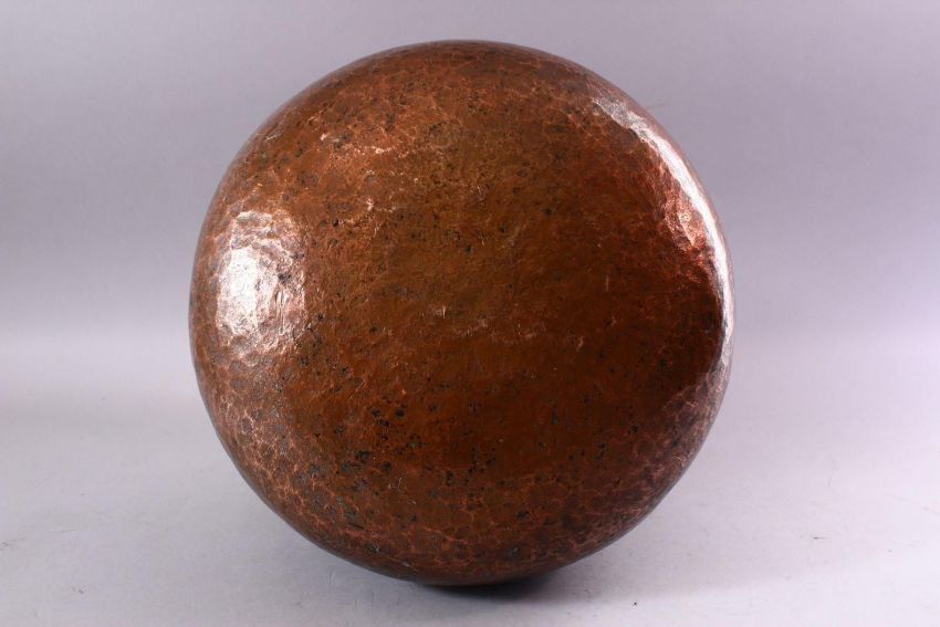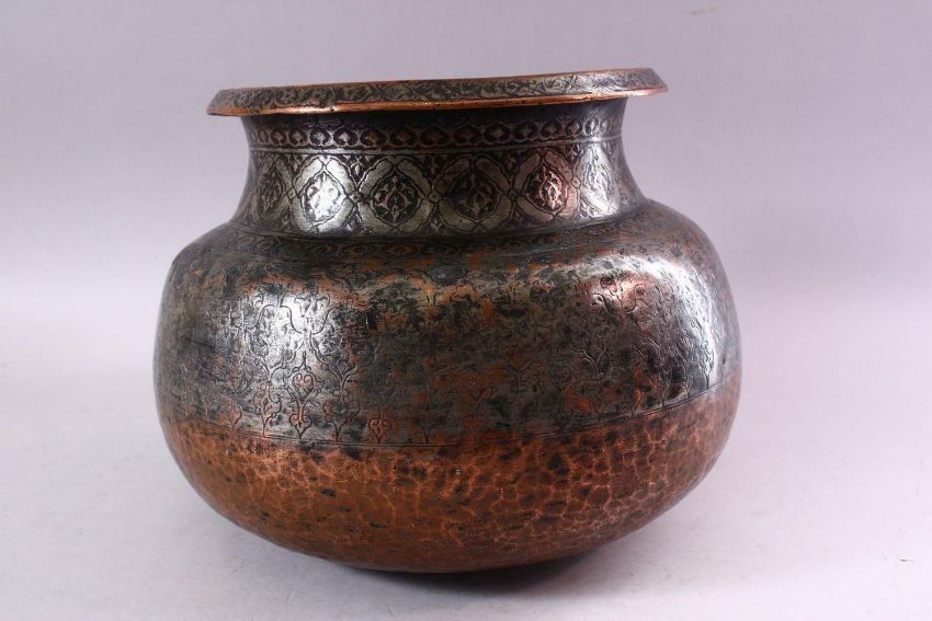 A 17TH CENTURY INDIAN TINNED COPPER LARGE CIRCULAR BOWL, with foliate engraved rim, the neck and sides with stylised motifs, approx. 30cm diameter, 23cm high.
