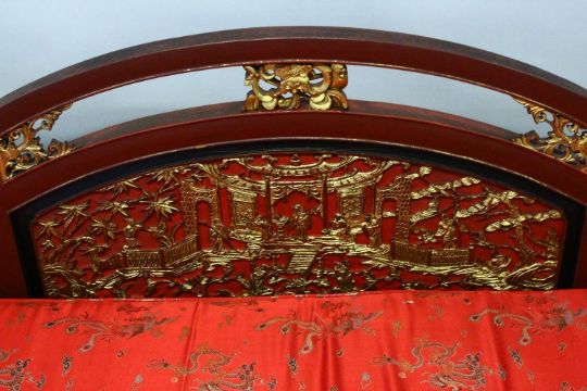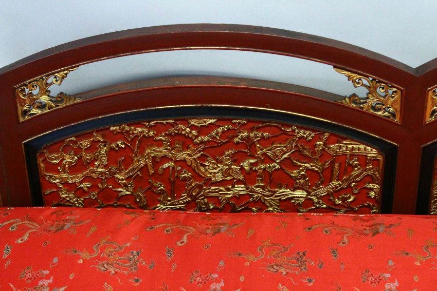 AN IMPRESSIVE CHINESE CARVED GILDED AND RED LACQUERED SETTEE, the triple humped back with gilded panels depicting landscape scenes and figures, upholstered loose cushion on a solid base with decoratively carved, pierced and gilded frieze supports, 236cm long, 80cm high, 66cm deep.