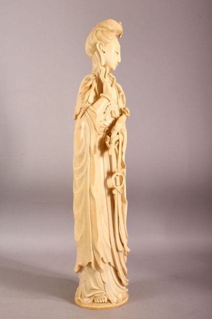 A SUPERB LARGE CHINESE IVORY TUSK CARVING OF A STANDING GUANYIN, the right hand raised, her left hand holding a scepter, signed to the base, 57cm high. Weight 4800g.
