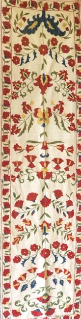 A EMBROIDERED COTTON TABLE RUNNER, 20th Century, Susuani Uzbekistan, 5ft 7ins x 1ft 8ins.