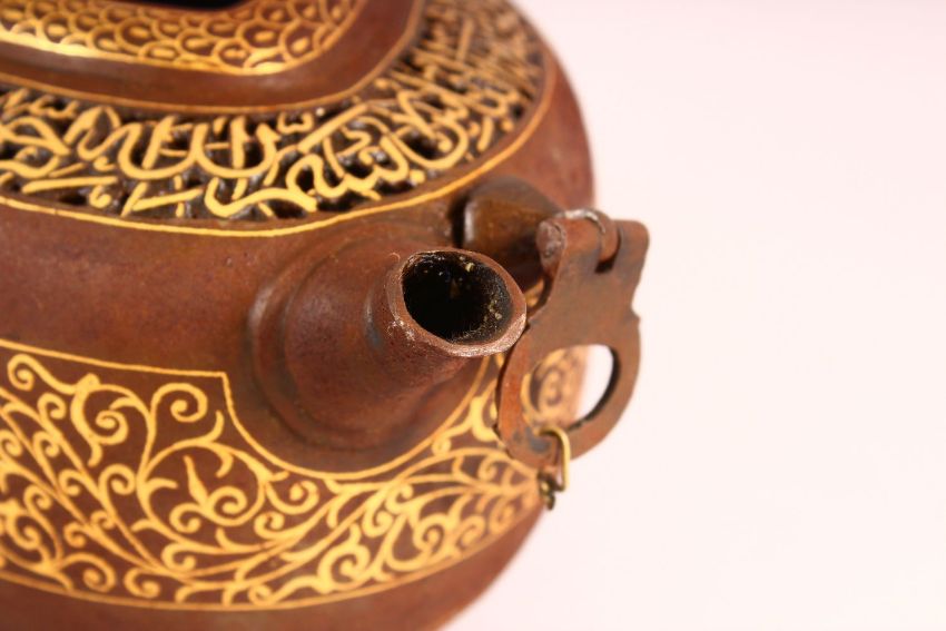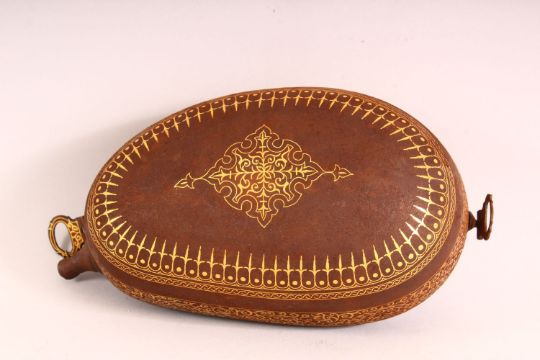 AN ISLAMIC QAJAR STYLE GOLD INLAID STEEL CALLIGRAPHIC KASHKOOL, with open work and inlaid calligraphy, with tin handles and a spout, 31cm