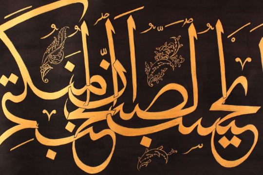 A TURKISH PAINTED CALLIGRAPHY PANEL, black and gilt calligraphy, 62cm x 42cm