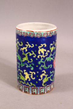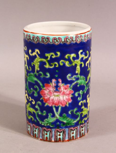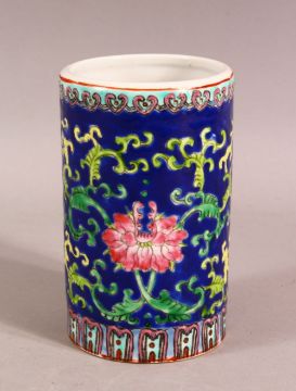 A CHINESE REPUBLIC STYLE FAMILLE ROSE PORCELAIN BRUSH WASH - decorated upon a blue ground with scrolling floral decoration - the base with a stamped red seal mark - 13cm high