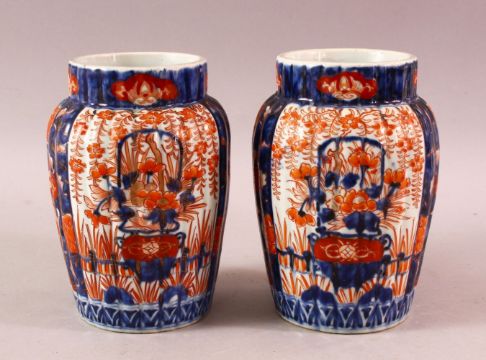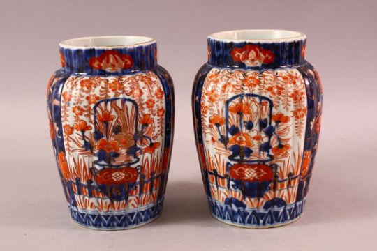 A PAIR OF JAPANESE MEIJI PERIOD PORCELAIN IMARI VASES, with ribbed body and floral panel decoration, 19cm