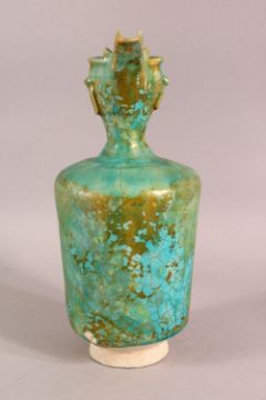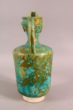 A KASHAN TURQUOISE GLAZED POTTERY EWER, 27cm high.