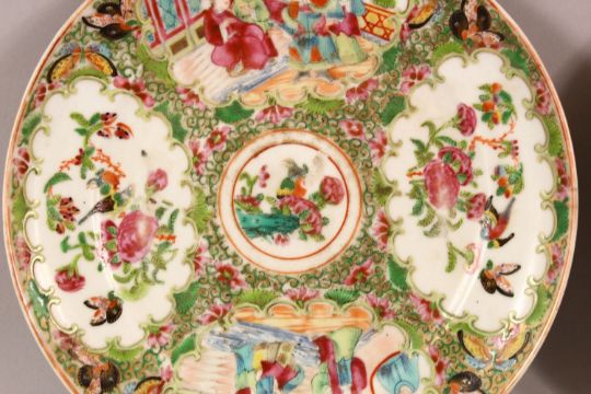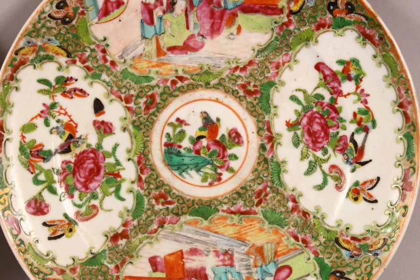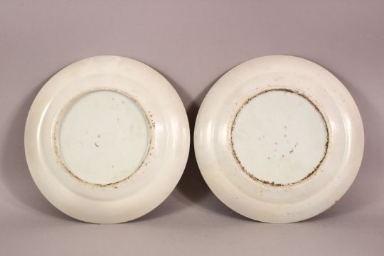 A PAIR OF 19TH CENTURY CHINESE FAMILLE ROSE PORCELAIN PLATES - decorate with typical scenes of figures & birds and flora - 21.5cm