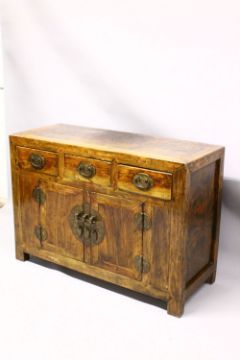 A GOOD MID 19TH CENTURY TIANJIN ELM WOOD CABINET/SIDE BOARD, with a planked rectangular top, three frieze drawers over a pair of doors, all with brass handles, back plates and hinges, 127cm long, 51cm deep, 89cm high.