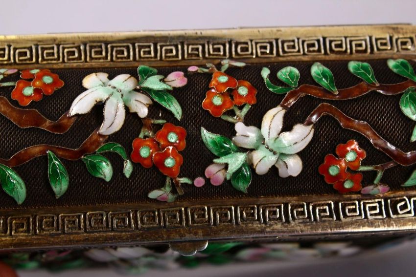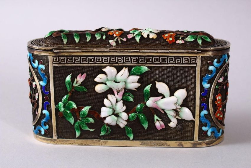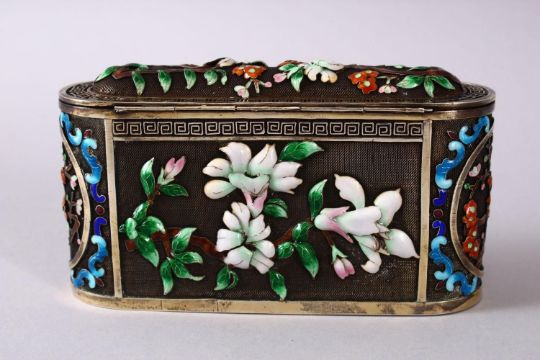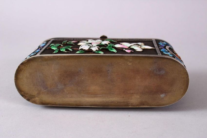 A CHINESE SILVER & ENAMEL LIDDED BOX, with enamel decoration of native flora, base marked silver, 15cm