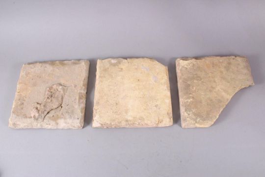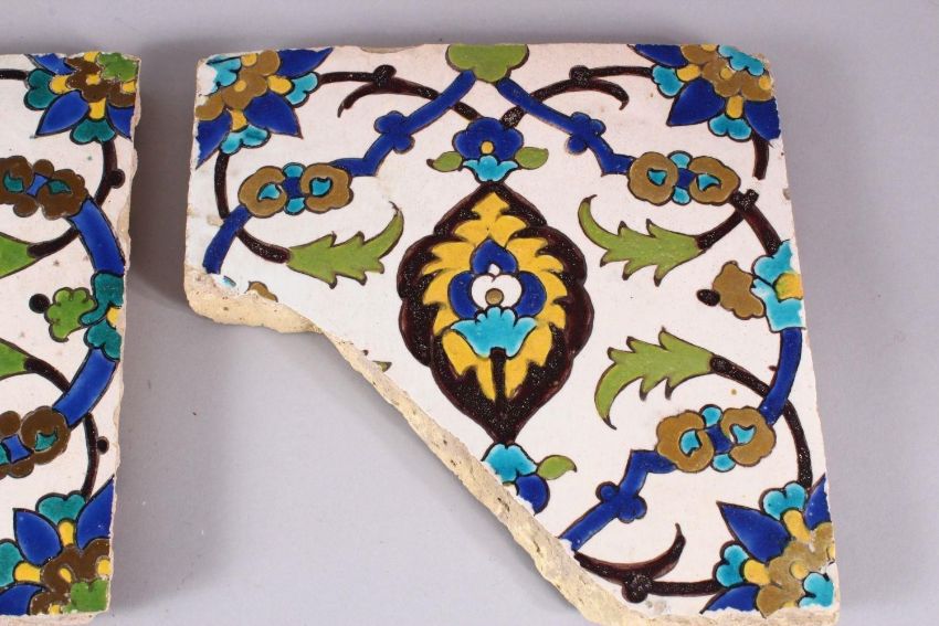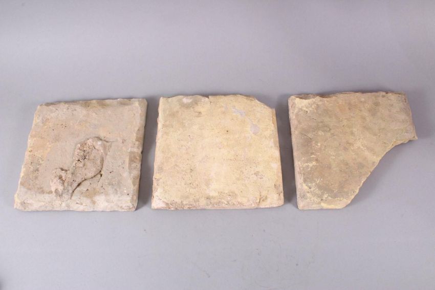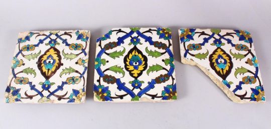 A SET OF THREE EARLY SAFAVID POTTERY TILES, each with the same decoration, white ground ith blue brown and yellow floral motif decoration, approx 24cm square each.