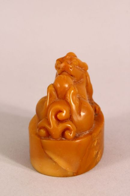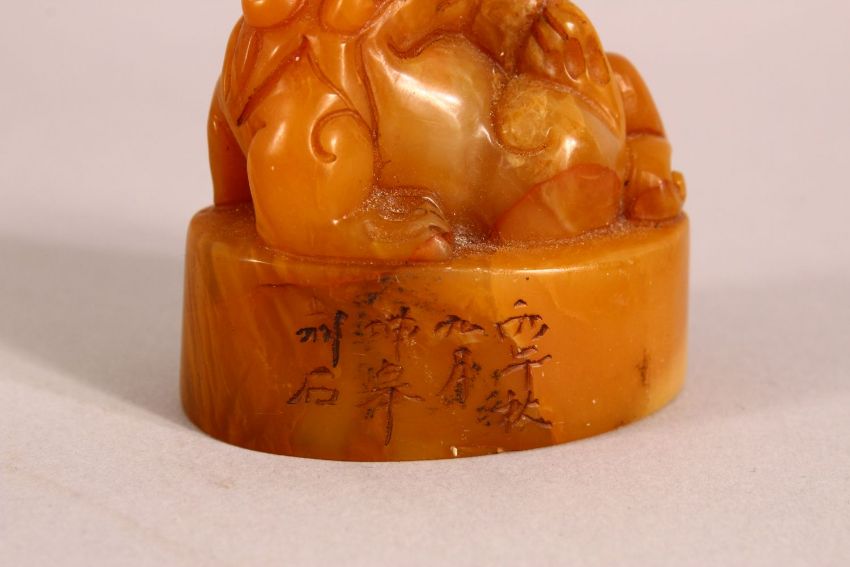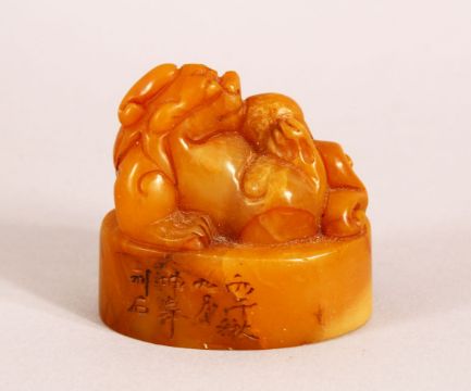 A CHINESE CARVED AMBER COLOUR SOAPSTONE SEAL OF A LION DOG - the dog on its back , the base carved with characters, 5cm