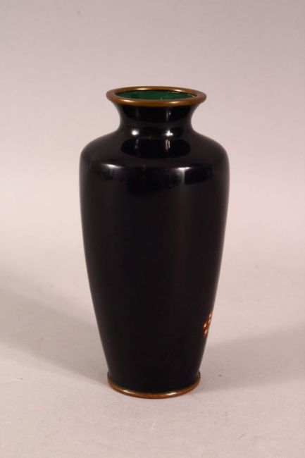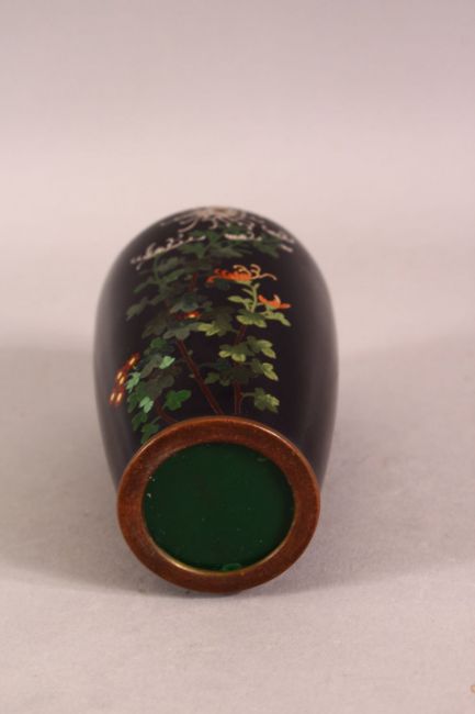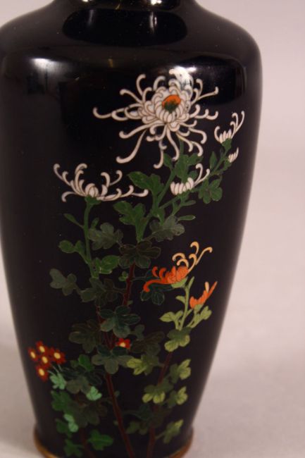 A JAPANESE MEIJI PERIOD CLOSIONNE SILVER WIRE VASE - The small vase with silver wire decoration depicting display of chrysanthemum, with metal mounts - 12cm high