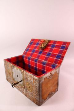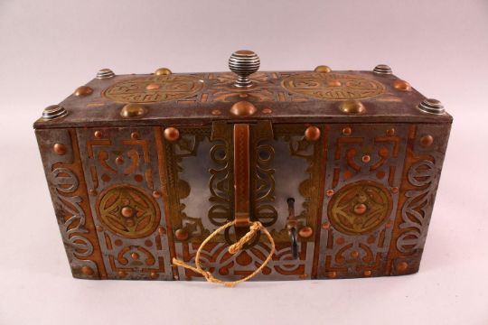 A FINE NORTH AFRICAN TUAREG STEEL, COPPER AND BRASS BOUND WOODEN CASKET, with pierced and partially engraved decoration, 41cm long, 20cm high, 20cm deep.