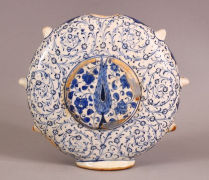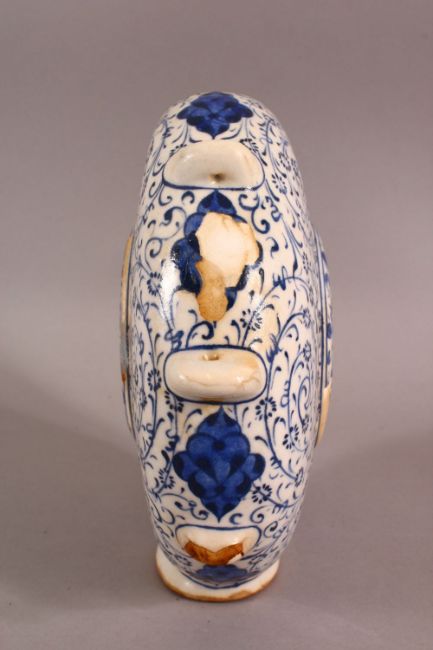 A GOOD TURKISH IZNIK POTTERY WATER FLASK - decorated with scrolling foliage and flora 18cm high .