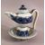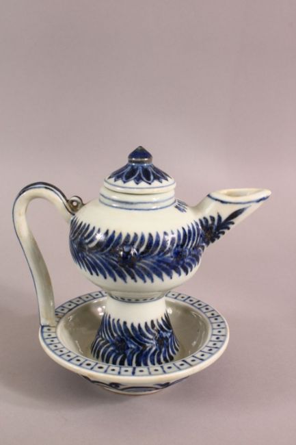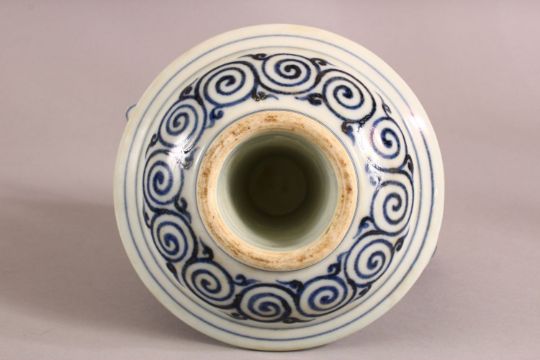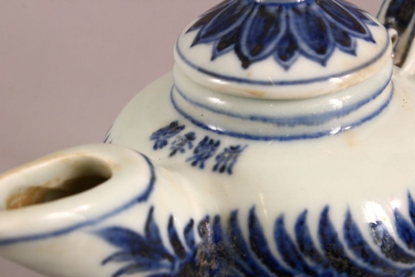 A CHINESE BLUE AND WHITE TEAPOT, painted with bands of foliate decoration, the base with built in stand, four character mark above the spout, 19cm high, 19cm wide (spout to handle).