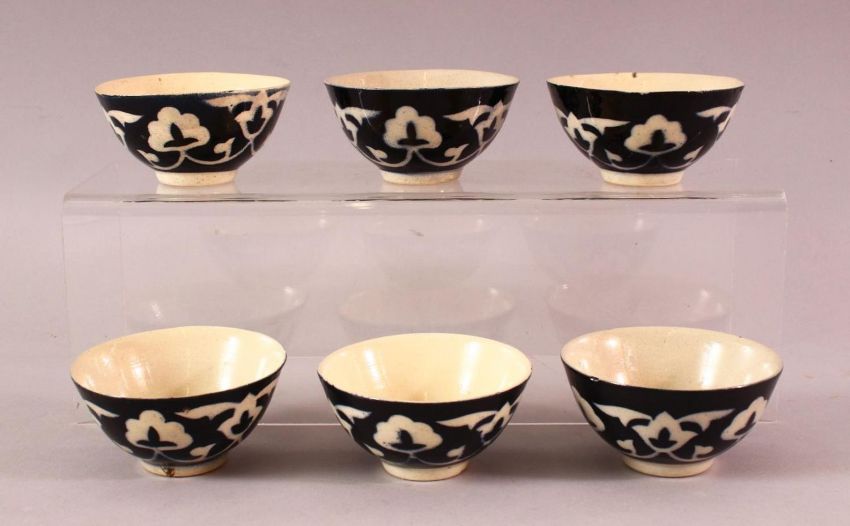 SIX SMALL RUSSIAN POTTERY TEA BOWLS for the Persian market, 8.5cm diameter.