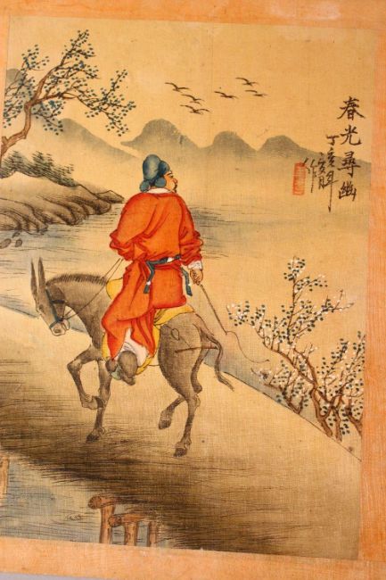 A COLLECTION OF FIVE CHINESE PAINTINGS ON PAPER, depicting scholars, birds, and a figure on a mule, 25.5cm x 19.5cm.
