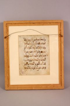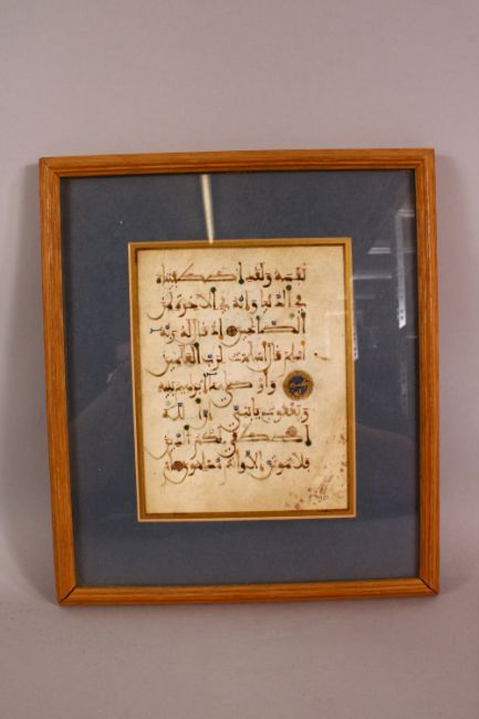 A FRAMED AND GLAZED KUFIC CALLIGRAPHIC MANUSCRIPT PAGE, double-sided, glazed on both sides, overall 31cm x 27cm.