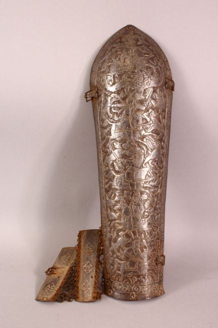 A 19TH CENTURY PERSIAN QAJAR STEEL ARM GUARD, 34cm long.