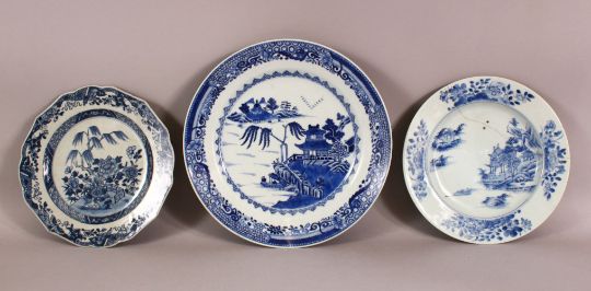 THREE 18TH / 19TH CENTURY BLUE & WHITE PORCELAIN PLATES - each with landscape views - two AF - 23cm & 28cm