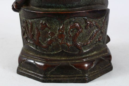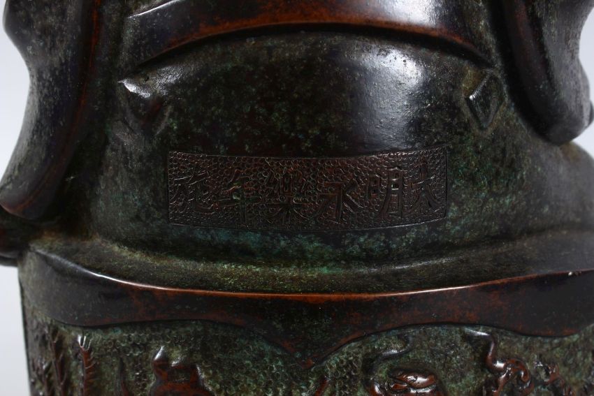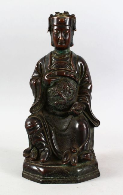 A GOOD CHINESE 19TH / 20TH CENTURY BRONZE FIGURE OF A SEATED EMPEROR, the bronze modelled seated with a carving in his left palm and holding aloft his gown to reveal a dragon, the reverse with moulded dragons, and bearing a six character Yong le mark, 38.5cm high x 18cm wide x 15.8cm deep.