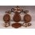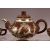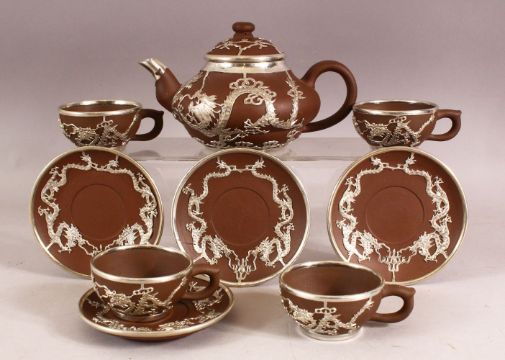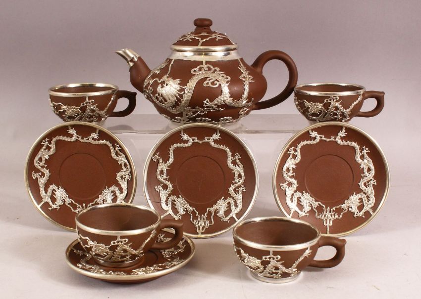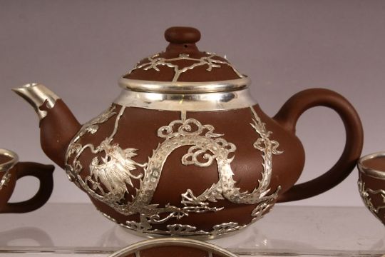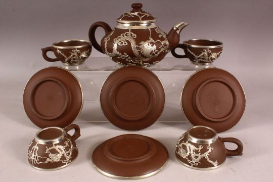 A CHINESE YIXING POTTERY WHITE METAL OVERLAID TEAPOT with four matching cups and saucers, teapot: 19cm wide.