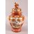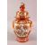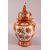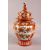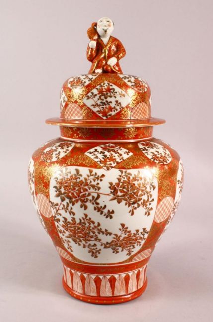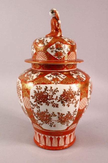 A LARGE JAPANESE KUTANI BALUSTER SHAPED VASE AND COVER, the cover with finial modelled as a seated figure, decorated all over with sprays of flowers, overall height 37cm.